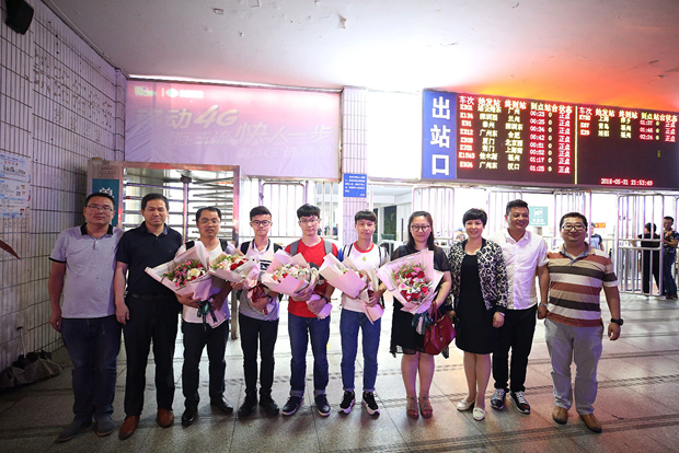 31日晚,副校长彭晓兰、信息学院领导赶赴火车站迎接获奖选手载誉归来,选手所在班级同学在宿舍楼下热烈欢迎。欢迎现场,彭晓兰高度赞扬了获奖选手团结拼搏、奋勇争先、为校争光的精神,勉励在场其他同学向获奖选手学习,勤奋进取、争创佳绩。