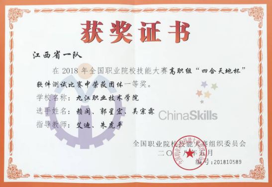 九江职院新闻网讯(信息工程学院)5月31日,从2018全国职业院校技能大赛传来喜讯,由我校信息工程学院教师艾迪、朱虎平指导,学生郭星宏、赖闽、吴宗霖组成的竞赛团队,代表江西省在高职组“软件测试”赛项中荣获团体一等奖的佳绩。