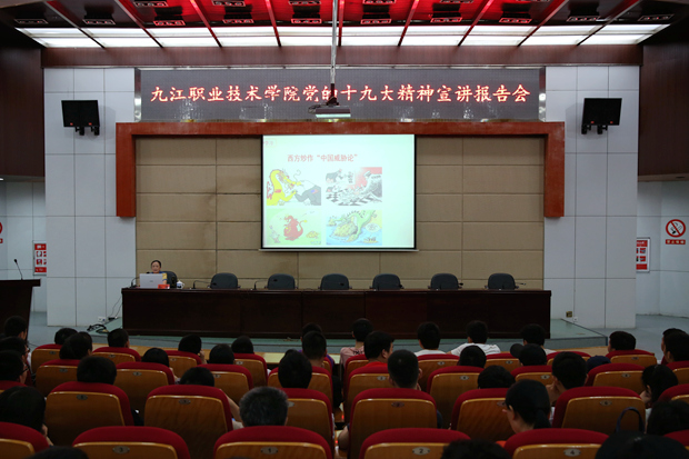 九江职院新闻网讯(党委宣传部)6月8日16时30分,我校“党的十九大精神宣讲小组”在十里校区四号学术厅举行专题宣讲报告会。宣讲小组成员、马克思主义学院教师孙园担任主讲,各二级学院党员、教师及后勤服务集团党员干部参加。