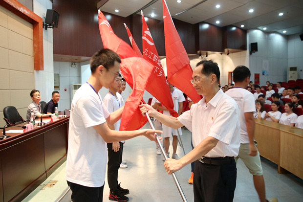 出征仪式上,刘南平副校长为我校4支重点社会实践团队授旗。