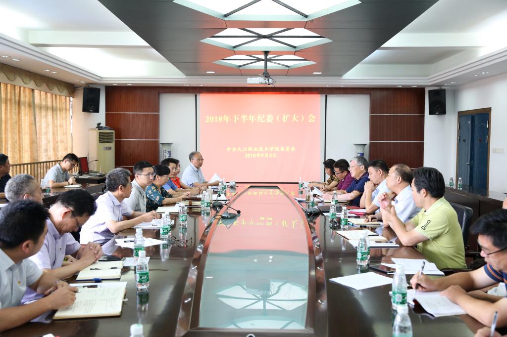 九江职院新闻网讯(纪监办)9月3日下午,我校召开2018年下半年纪委(扩大)会,传达上级纪委有关会议精神,组织学习新修订的《中国共产党纪律处分条例》,部署今年下半年纪检监察工作。党委书记魏寒柏出席会议并发表讲话,纪委书记殷锡武主持会议,校纪委委员、党群部门主要领导、各党总支、直属党支部书记参加会议。