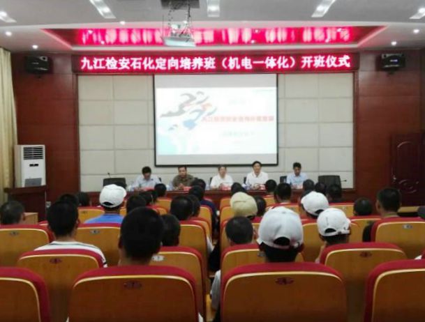 九江职院新闻网讯(机械工程学院)9月15日上午,九江检安石化定向培养班(机电一体化)开班仪式在十里校区二号学术报告厅举行。副校长汪永根、九江检安石化工程有限公司总经理周会武出席,机电一体化专业教师及订单班班主任、同学参加。机械工程学院主持工作的副院长郭文星主持仪式。