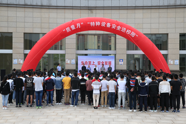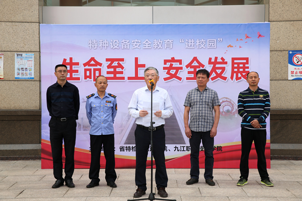 九江职院新闻网讯(后勤集团服务集团 张维维)9月27日下午,我校联合江西特检院在濂溪校区综合办公楼开展了以“生命至上、安全发展”为主题的特种设备安全教育“进校园“活动。校党委委员、纪委书记殷锡武出席,江西特检院九江分院、濂溪区市场和质量监管局莲花分局负责人,我校后勤管理处、濂溪办、保卫处负责人以及200余名新生参加此次活动。