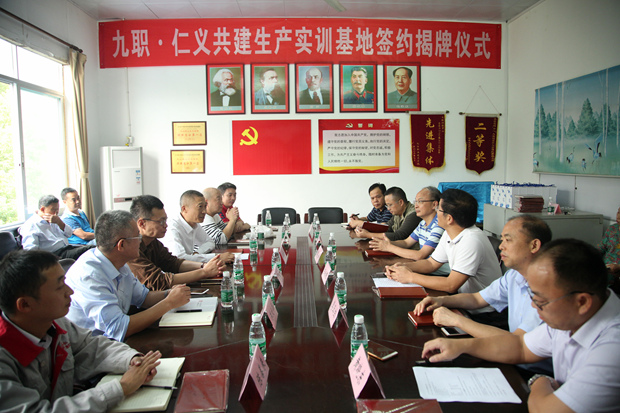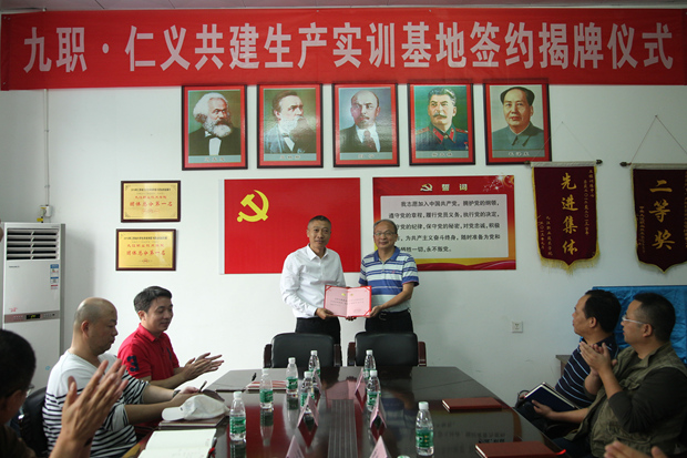 仪式上,魏寒柏书记与葛东阳总经理共同为“九职·仁义共建生产实训基地”揭牌。同时,魏书记还为葛东阳颁发了“九江职业技术学院客座教授”聘书。
