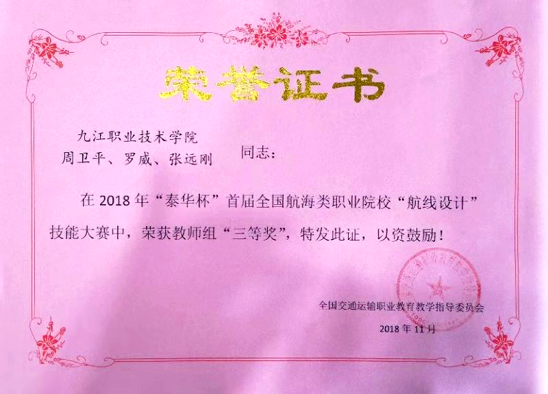 九江职院新闻网讯(船舶工程学院 周卫平)11月17日上午,“泰华杯”首届全国航海类职业院校“航线设计”技能大赛在江苏海事职业技术学院举行,全国20余所航海类高职院校师生参赛。我校船舶工程学院推选的教师组荣获三等奖、学生组荣获优胜奖。