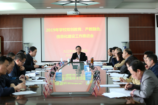 九江职院新闻网讯(校长办公室)3月19日14时30分,我校在十里校区3号教学楼大会议室召开双创教育、产教融合、信息化建设工作推进会,校长曾青生,党委副书记刘南平,副校长彭晓兰、汪永根出席会议,相关职能部门及各二级学院负责人参加。