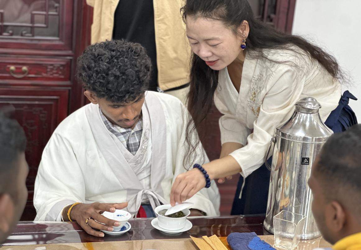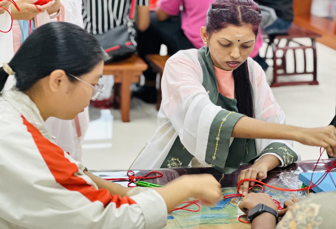 活动以非物质文化遗产体验为主线,贯穿始终。“茗香雅叙”环节,图书馆吕晓燕老师以庐山云雾茶、桂花红茶为载体,演示温杯、投茶、注水的传统茶艺流程,留学生们在袅袅茶香中品尝九江茶饼等当地非遗美食;在“绳结寄情”“扎染漆扇·妙笔生花”环节,创新设置各具特色的文化体验区,留学生们用红绳、剪刀、毛笔、团扇等工具创作出一个个独具匠心的作品。充满创意的吉祥结书签、晕染了独特花纹的染布、融合中马元素纹样的漆扇……让留学生们直呼“中华传统文化像魔法一样神奇”。