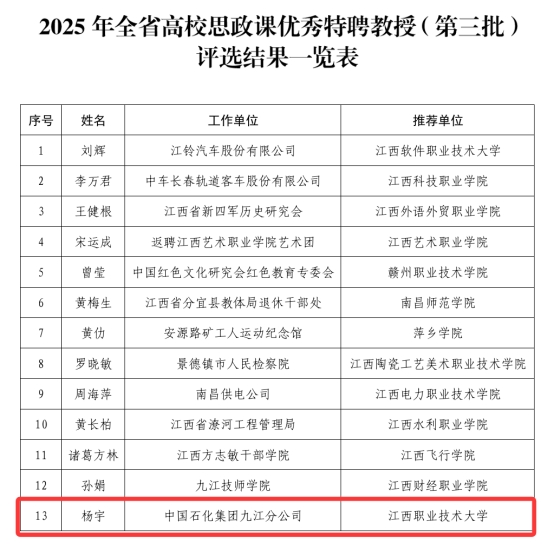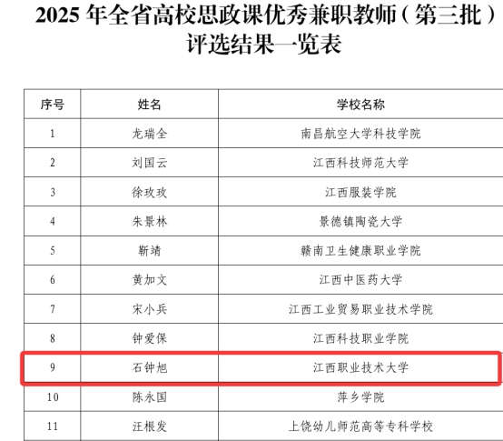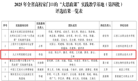 其中,马克思主义学院曾勇教师团队联合九江市周敦颐纪念馆,共同推进思政课实践教学改革,纪念馆成功入选全省家门口的“大思政课”实践教学基地;学校特聘思政课教师杨宇入选全省高校思政课优秀特聘教授;兼职思政课教师石钟旭入选全省高校思政课优秀兼职教师。