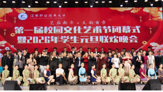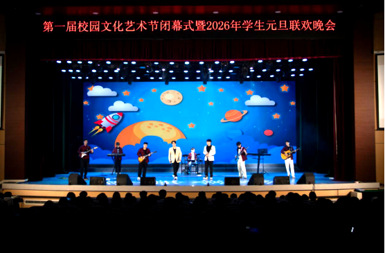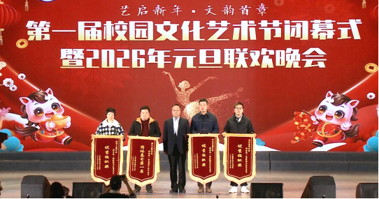 本网讯(学生工作处)12月28日晚,我校第一届校园文化艺术节闭幕式暨2026年学生元旦联欢晚会在十里校区大礼堂举行。副校长卢致俊出席,相关职能部门、二级学院负责人及近900名师生到场观看。