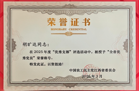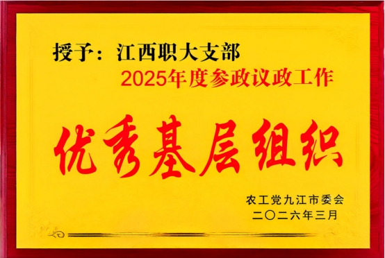 本网讯(党委统战部)近日,农工党江西省委员会下发《农工党江西省委会关于2025年度“优秀支部”评选活动的表彰通报》,对2025年以来全省基层组织“优秀支部”创建工作中表现突出、成效显著的基层组织和先进个人予以表彰。我校农工党支部主委胡旷达荣获“全省优秀党员”称号,农工党江西职业技术大学支部获评农工党九江市委会2025年度“优秀基层党组织称号”。