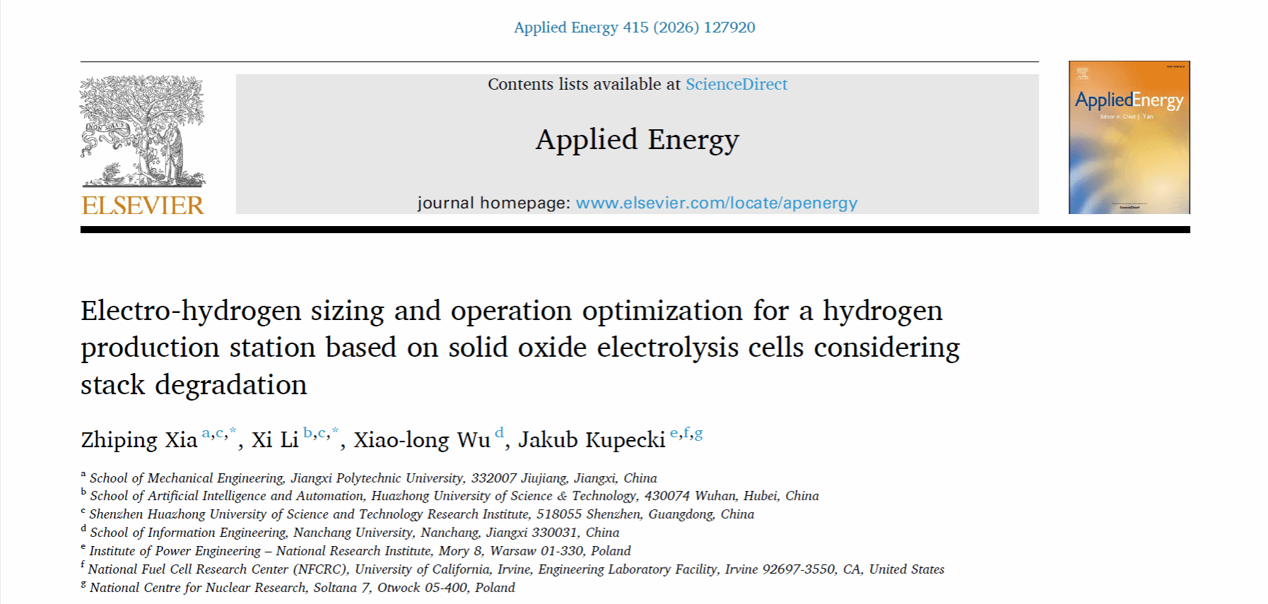 本网讯(科研处、机械工程学院)近日,我校机械工程学院夏志平博士团队在基于固体氧化物电解池(SOEC)的制氢站容量配置与运行优化研究方面取得重大进展,相关研究成果以“Electro‑hydrogen sizing and operation optimization for a hydrogen production station based on solid oxide electrolysis cells considering stack degradation”为题,发表于能源领域国际顶级期刊Applied Energy(影响因子11.2,中科院一区TOP期刊),为区域可再生能源储存、绿色氢能产业发展,以及船舶氢能系统技术开发应用等领域提供了理论基础和技术支撑。这是我校首次以第一作者和第一通讯单位在能源领域顶级学术期刊发表的研究论文。