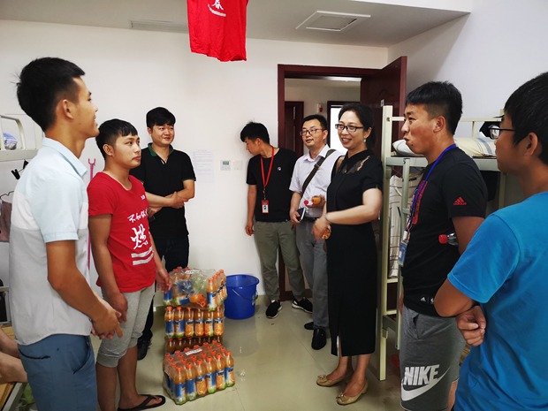 随后,占跃华一行在焦瑞勇的陪同下,深入学生实习场地进行考察,并来到员工宿舍看望慰问实习学生,与学生一起在食堂用餐,详细了解学生在企业的学习、工作、生活状况,现场协调解决学生提出的问题和意见,帮助学生调整心态,尽快适应企业的工作环境,争取优异的实习成绩。