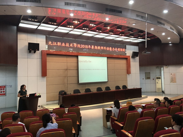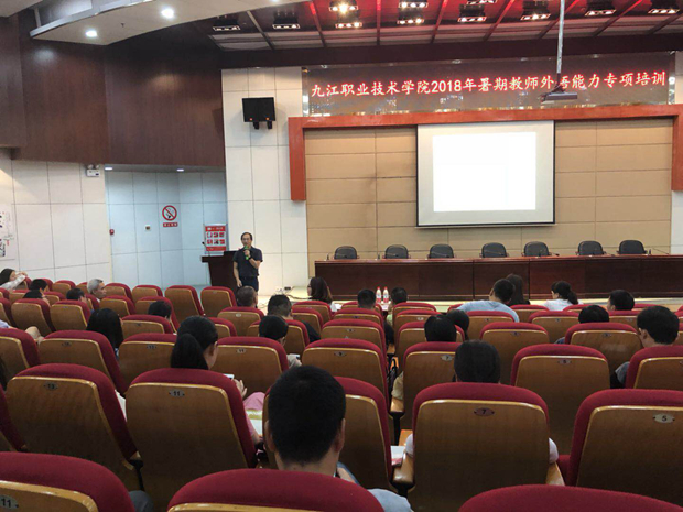九江职院新闻网讯(国际合作交流中心)7月5日上午8时30分,我校在十里校区4号学术厅开展2018教师外语能力专项培训,学校专业带头人、骨干教师及各二级学院教研室主任共115人参加。