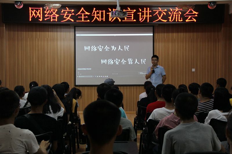 九江职院新闻网讯(团委 李晶)9月19日19时,校团委在十里校区老综合楼316多功能厅举行2018国家网络安全宣传周——网络安全知识宣讲交流会,校团委新媒体指导老师于永辉主讲,近百名学生代表到场聆听。