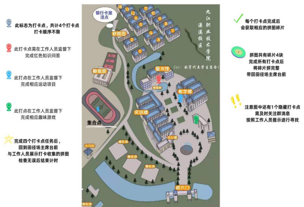 本次活动共设计4个校内打卡点,要求参与者以最快速度完成相应任务,并获取全部拼图。其中3个打卡点已标注在游戏地图上,同学们根据地图寻找,并完成红色知识竞答、双人跳绳、挤气球等相应点位的挑战项目后可分别获得一块拼图。最后一个隐藏打卡点需要参与者根据QQ群内的提示逐步进行寻找。同学们发挥聪明才智,现场气氛热烈,经过两个多小时的拼搏奋斗,最终京东移动2301班吴奕龙、龚志成率先完成全部打卡,荣获第一名。