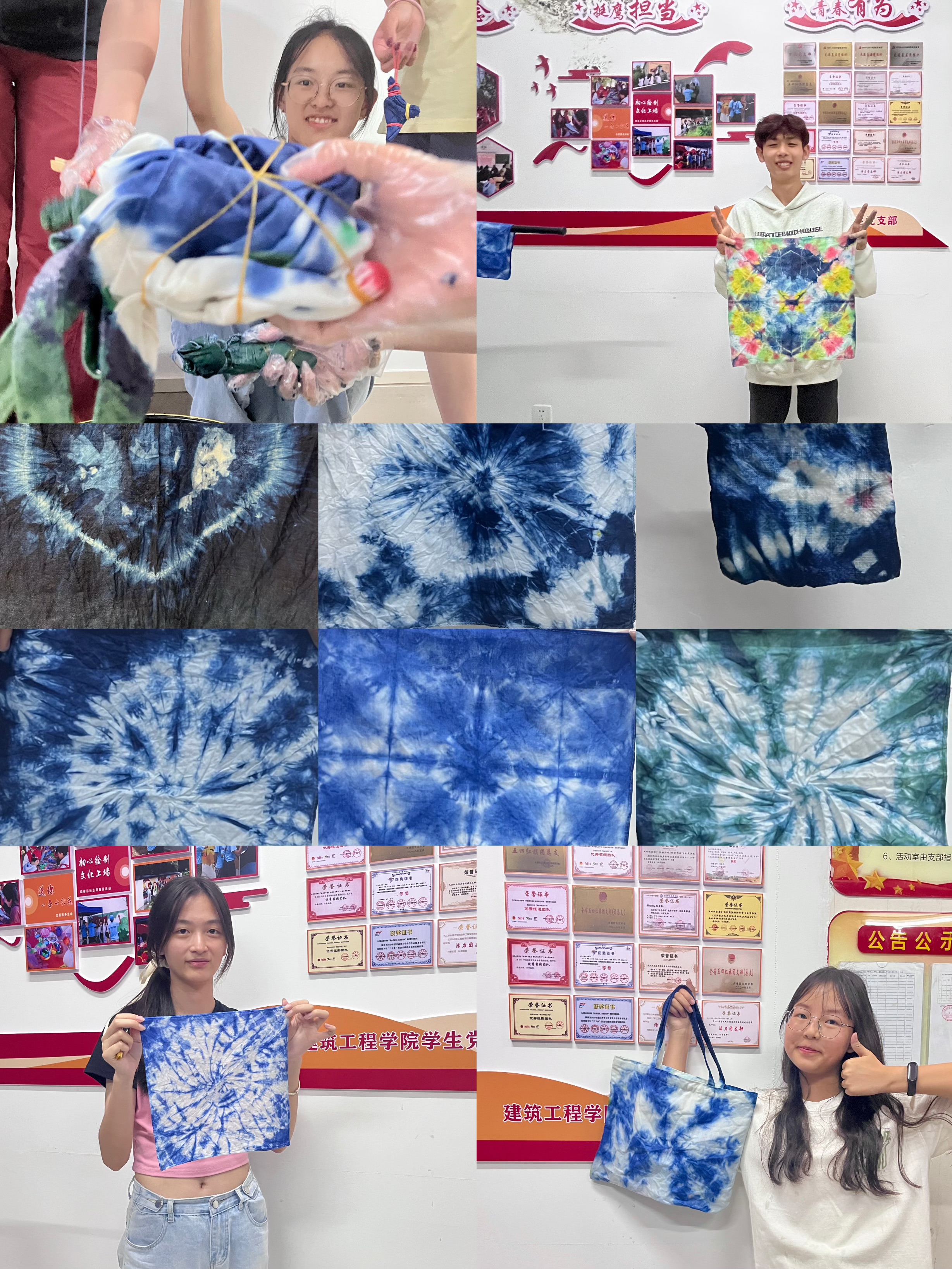 活动开始前,该院素质拓展中心学生工作人员通过视频带领同学们学习了扎染的起源、发展过程和工艺流程,并现场演示简单的扎染技法。大家听完讲解后,跃跃欲试,积极行动,从设计造型、捆扎到染色,再到最后的清洗和拧干晾晒,制作出一个个独一无二专属自己的扎染作品,活动现场气氛热烈,也吸引了路过的同学参与其中。