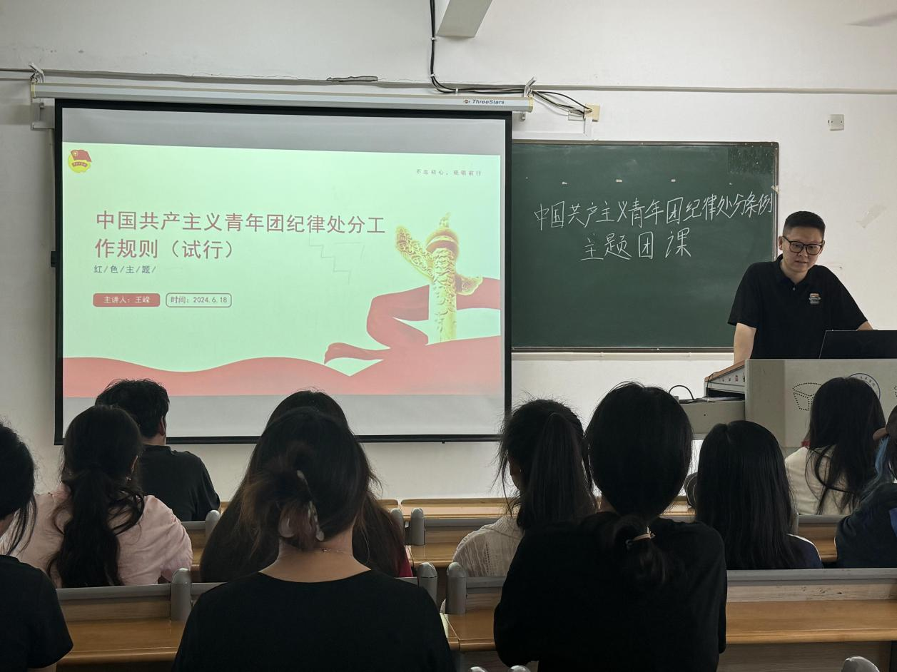 为进一步提升团员的纪律意识与法治素养,强化基层团组织建设,6月21日下午,经济管理学院团总支在濂溪校区教学楼615教室开展《中国共产主义青年团纪律处分工作规则(试行)》专题团课学习,该院团总支书记王嵘主讲,京东跨境2301团支部全体团员参加。
