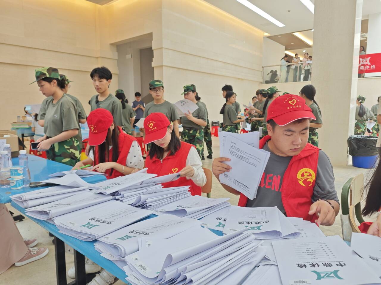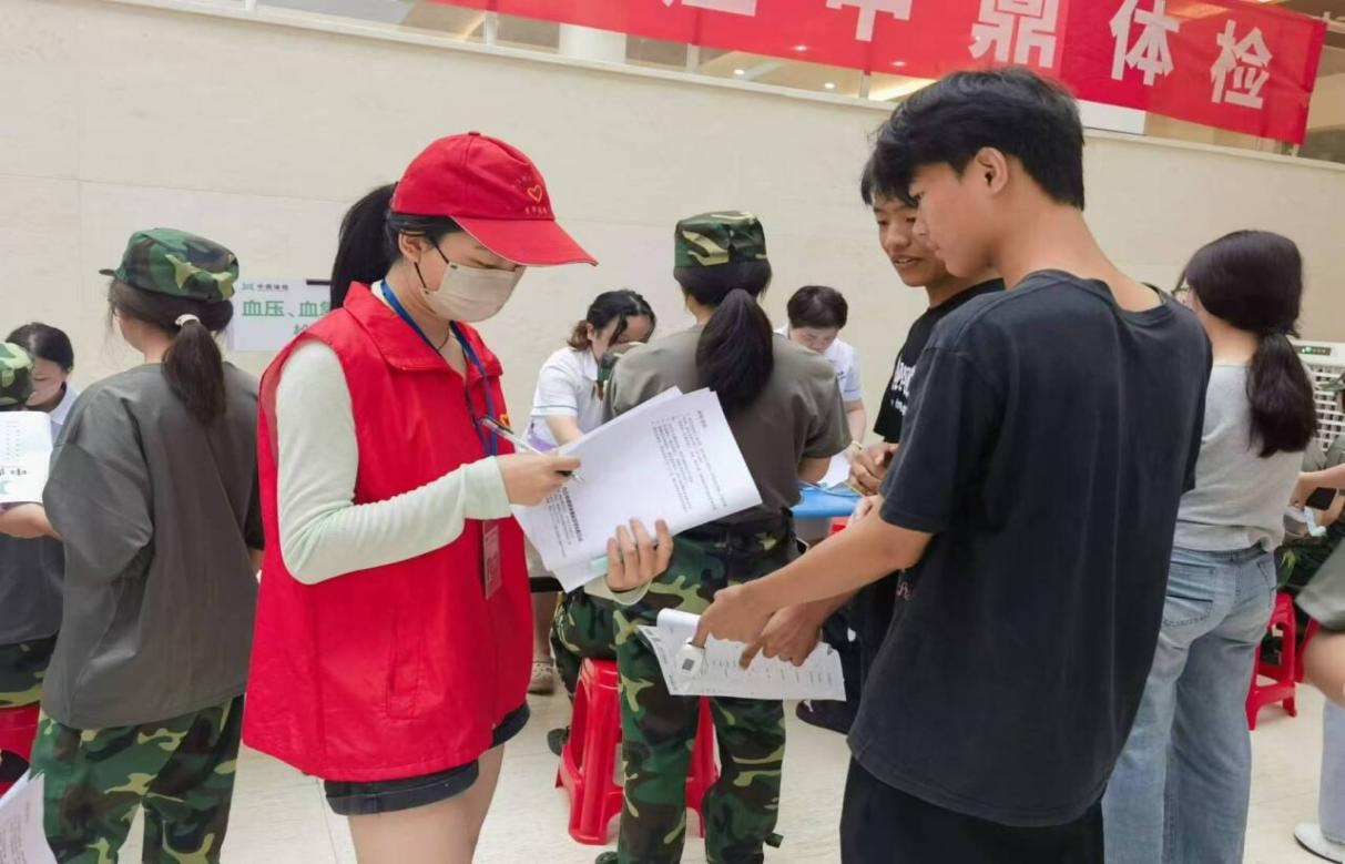 体检现场,志愿者们热情地引导新生们前往各个体检项目点,耐心地解答他们的疑问,并配合医务工作者们维护现场秩序,整理体检资料,确保每一位新生都能顺利完成体检。