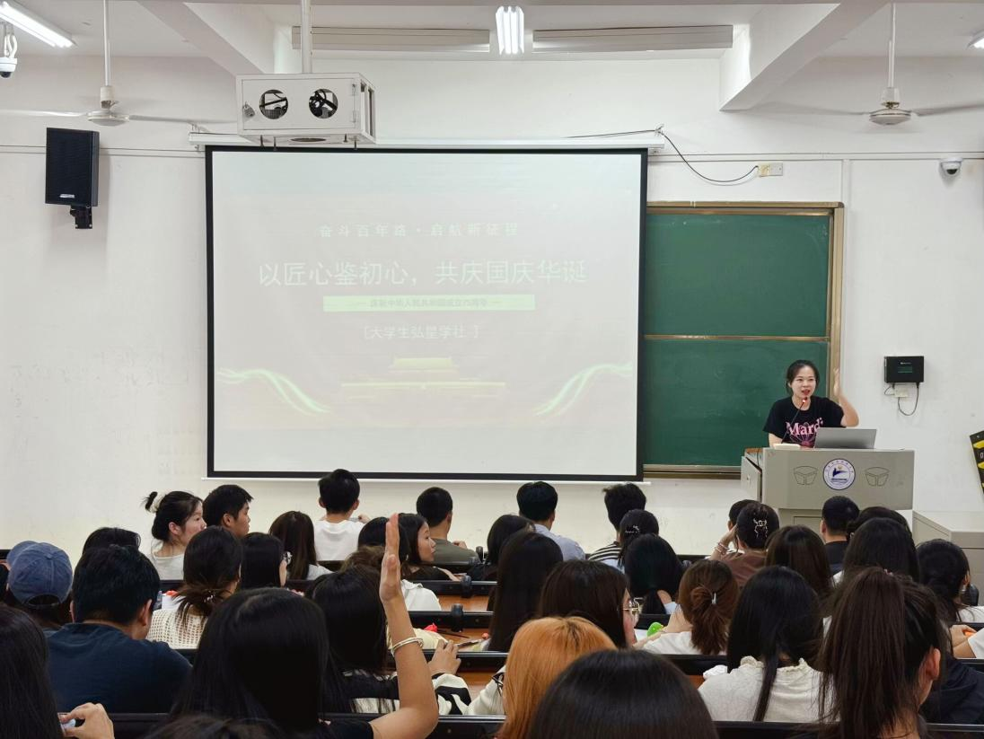本网讯 (经济管理学院 殷梓轩) 9月24日下午,经济管理学院大学生弘星学社在濂溪校区教学楼128教室开展“以匠心鉴初心 共庆祖国华诞”主题活动,社团指导老师殷梓轩主持,社团全体学生共计100余人参加。