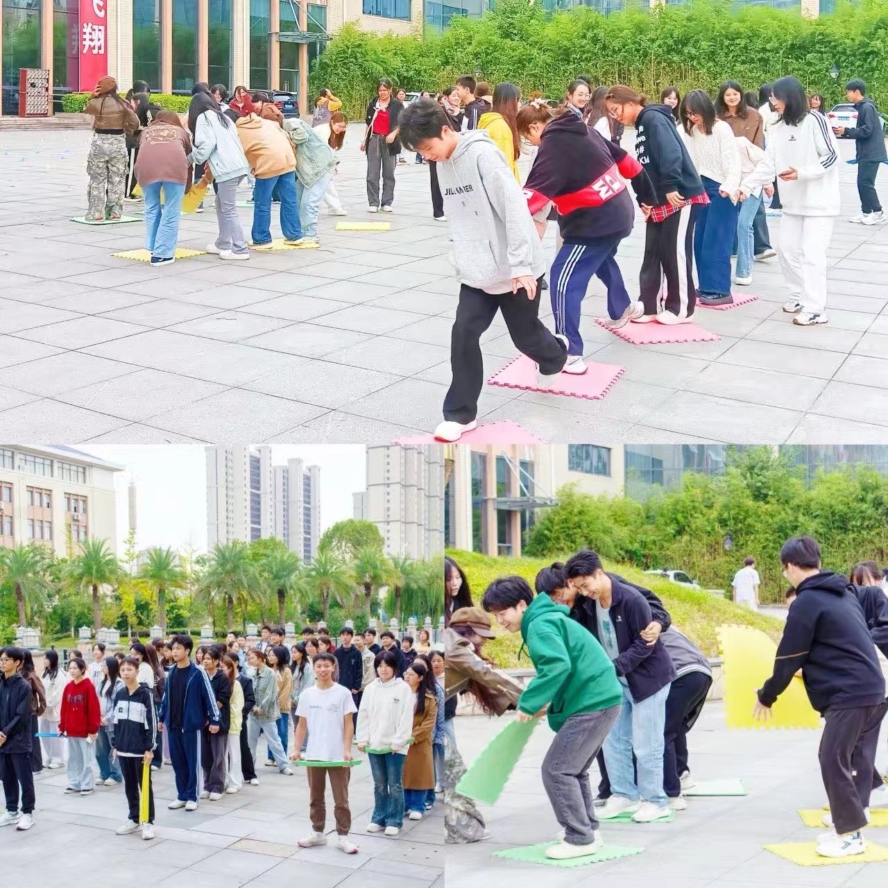 活动之初,全体成员在教学楼128室共同观看了纪录片《长征》中飞夺泸定桥的片段,直观感受红军战士们面对艰难险阻时所展现出的英勇无畏精神。随后,同学们前往图书馆门前广场,开展游戏体验活动体会长征路的艰辛与不易。游戏中,每个组使用仅有的3块泡沫垫,协作完成20米的行程,途中要求手脚不能碰到地面。