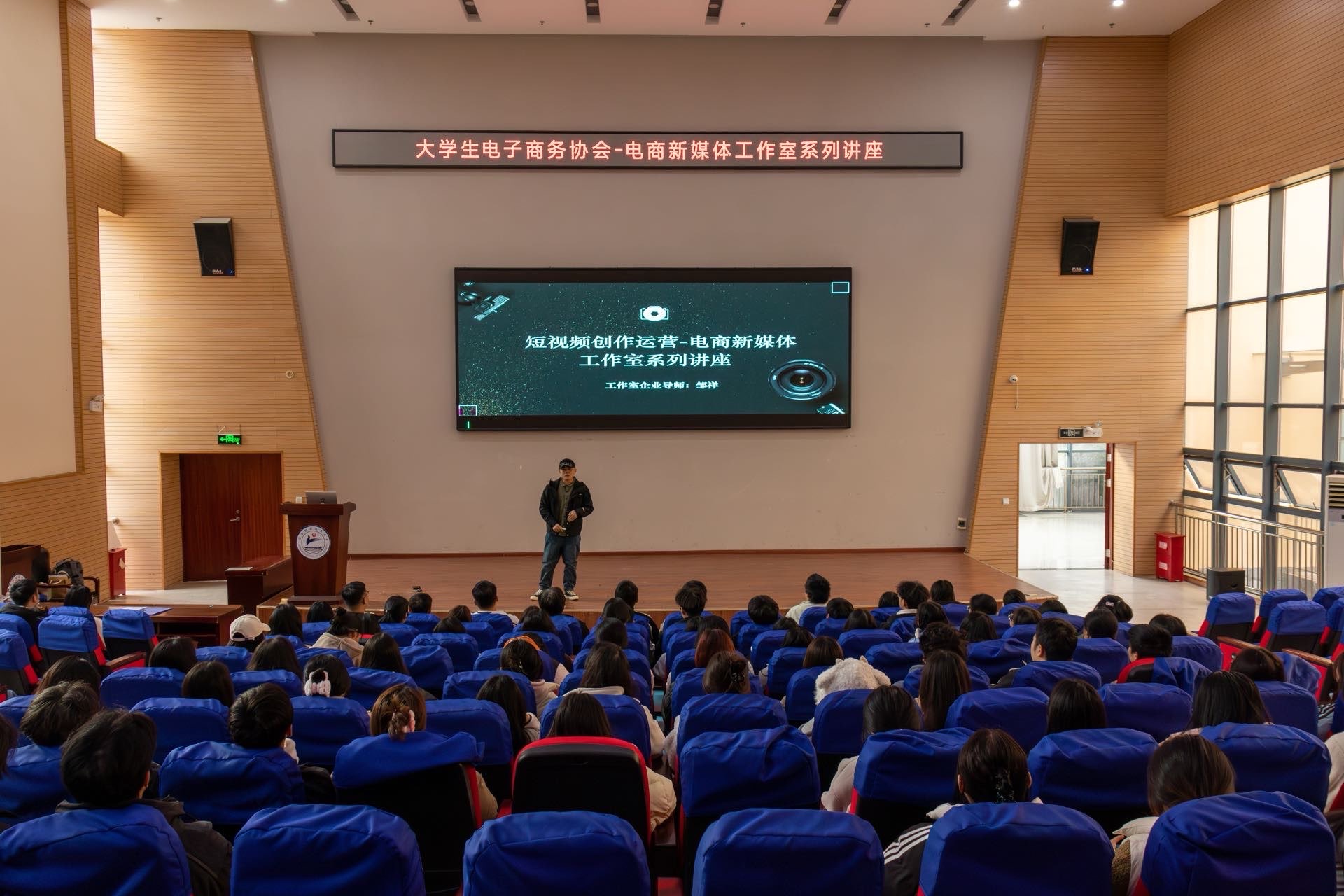 本网讯(经济管理学院)11月26日下午,经济管理学院大学生电子商务协会、商学英才学生创业协会和大学生市场营销协会在濂溪校区图书馆C区学术报告厅联合举办“孵化电商创业:短视频创作与运营”专题讲座,特邀经济管理学院联通&九正摄影工作室企业导师邹祥主讲,100余名学生参加。