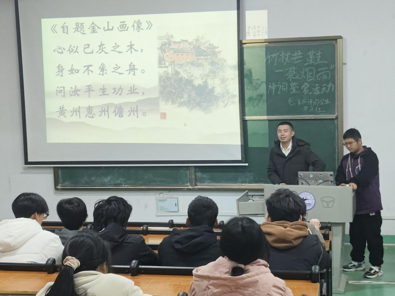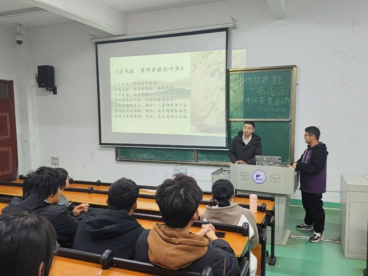 本网讯(信息工程学院)11月28日晚,信息工程学院毛泽东诗词学生学习社在濂溪校区实训楼108室开展 “竹杖芒鞋,一蓑烟雨”主题宋词鉴赏活动,该社团指导老师、辅导员雷哲瑞出席,近40名同学参加。