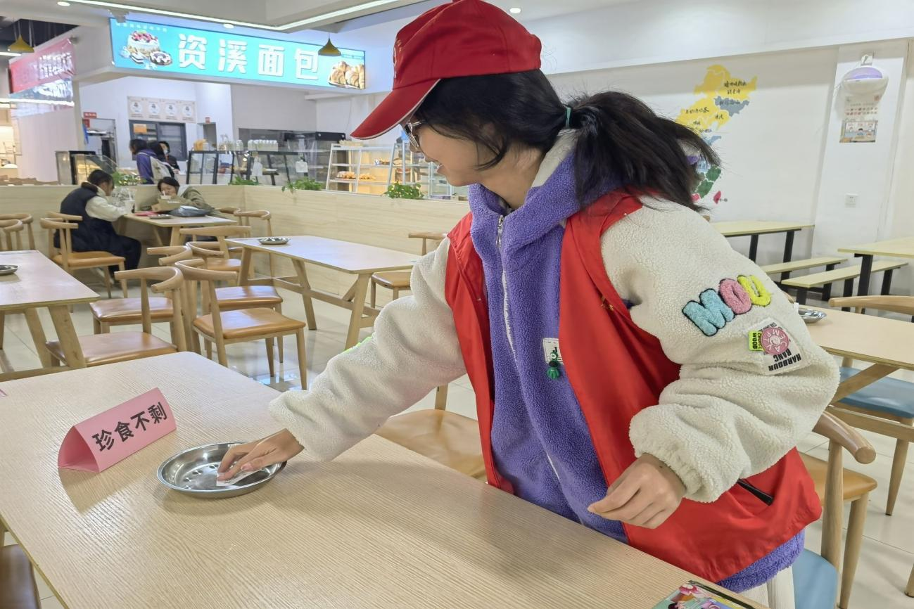 活动中,大家在食堂内积极向同学们宣传节约粮食的重要性,为就餐同学讲解粮食生产的不易。此外志愿者们在食堂每个骨碟边放置节约粮食标语,用语言的力量提醒每一位用餐的同学按需取餐、杜绝浪费,呼吁大家践行光盘行动。