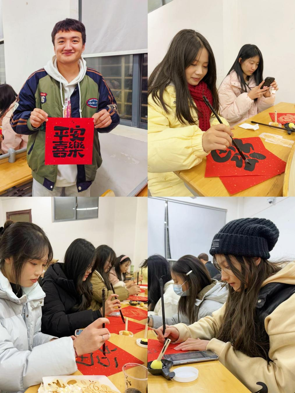 参加本次活动的学生主要是来自新疆、贵州、广西的维吾尔族、哈萨克族、苗族、壮族等少数民族的同学,大家拿起毛笔,在红纸上书写着寓意吉祥的福字。同学们除了用汉语书写以外,还用维吾尔语、哈萨克语等家乡文字书写祝福的话语,展示各民族的文化特色,表达对幸福生活的向往和美好未来的祝愿。
