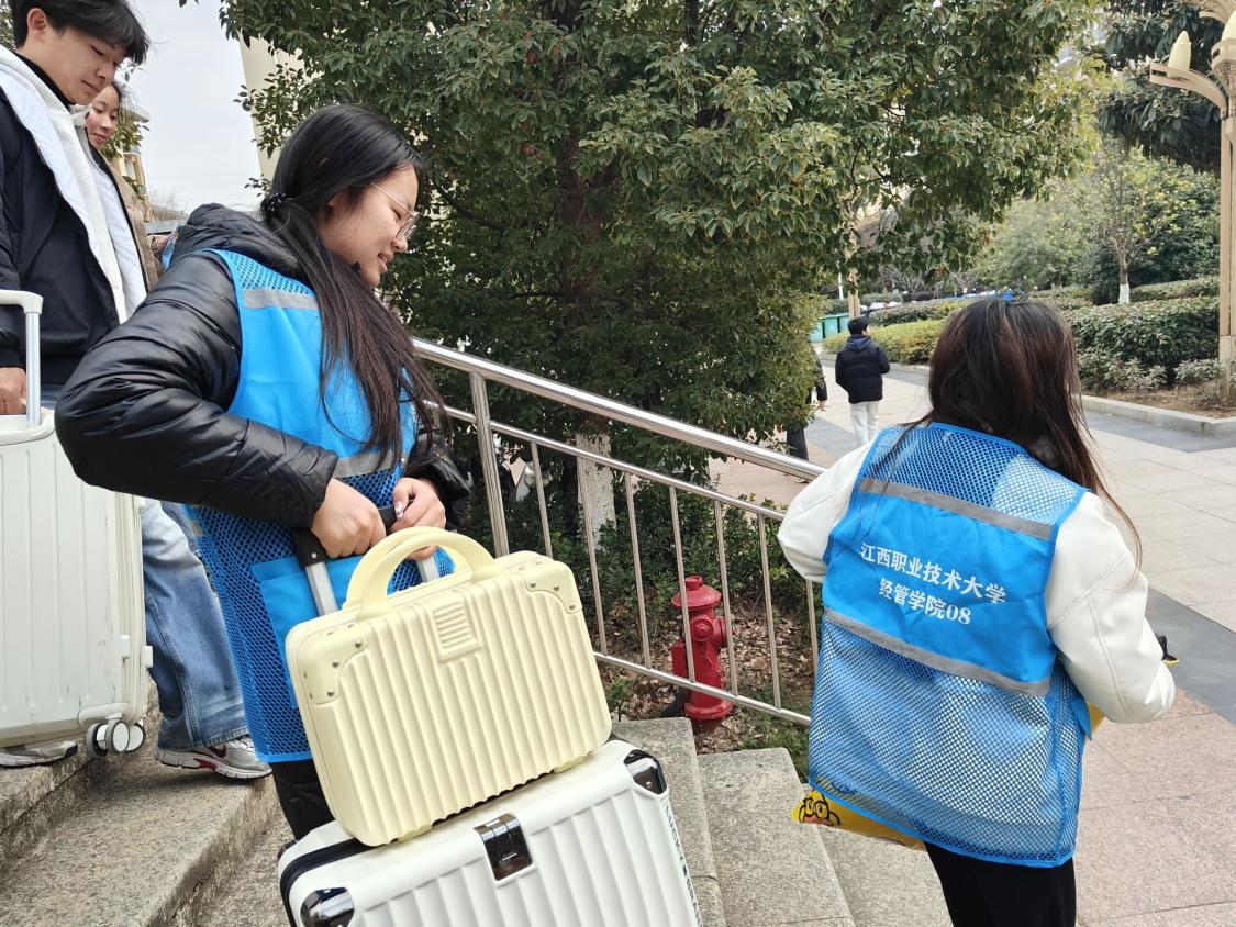 本网讯(经济管理学院)1月8日下午,经济管理学院学生会在濂溪校区宿舍楼开展“离校不离心,行李递温情”——我为同学做实事志愿服务活动,为离校同学搬运行李,传递温暖与关怀。