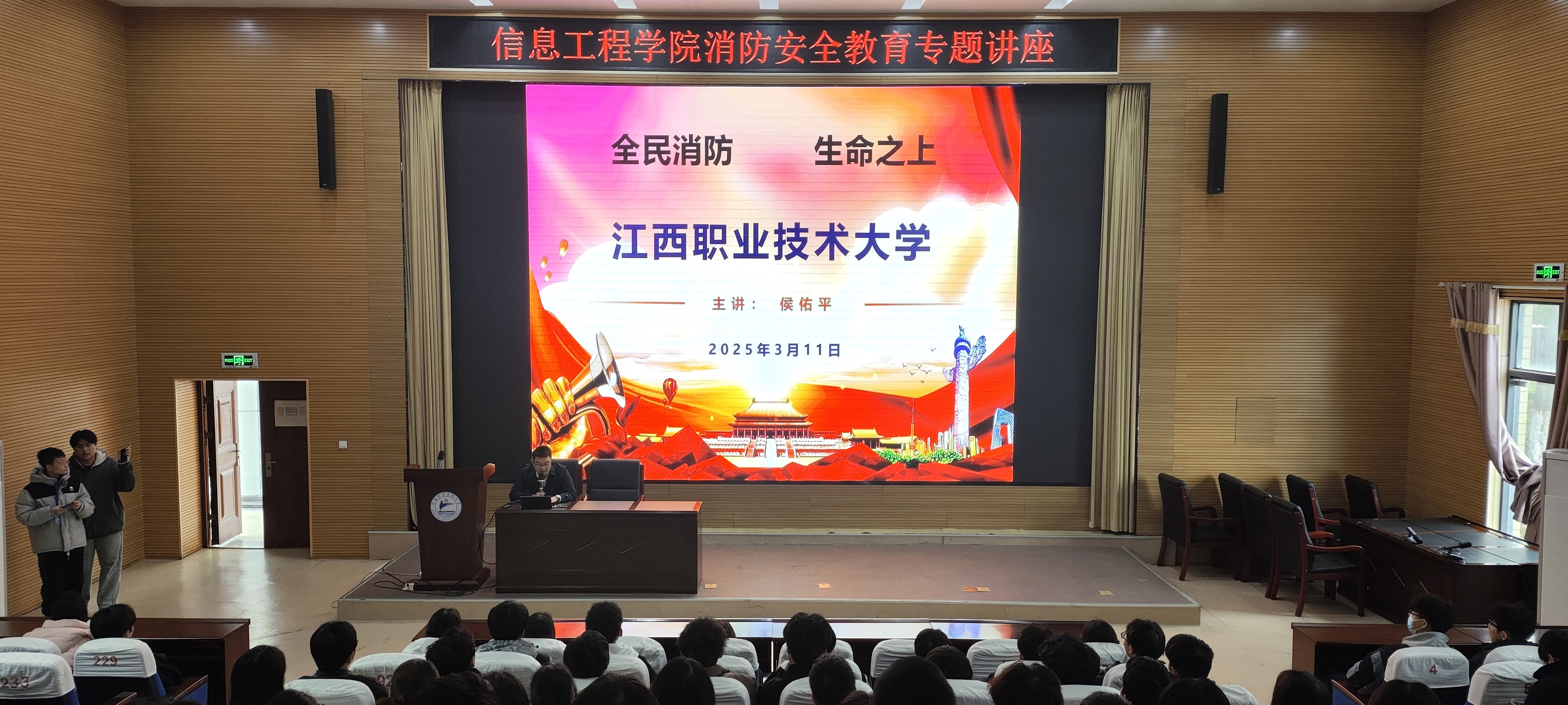 活动当天,九江市消安安全服务有限公司主任级讲师、一级注册消防工程师候佑平在办公楼报告厅为老师和同学们作专场讲座。他从消防典型案例分析、消防政策方针及法律法规、消防器材使用方法和消防逃生应急能力等方面为大家讲解了消防基本知识,并重点介绍了火场逃生的步骤和注意事项。
