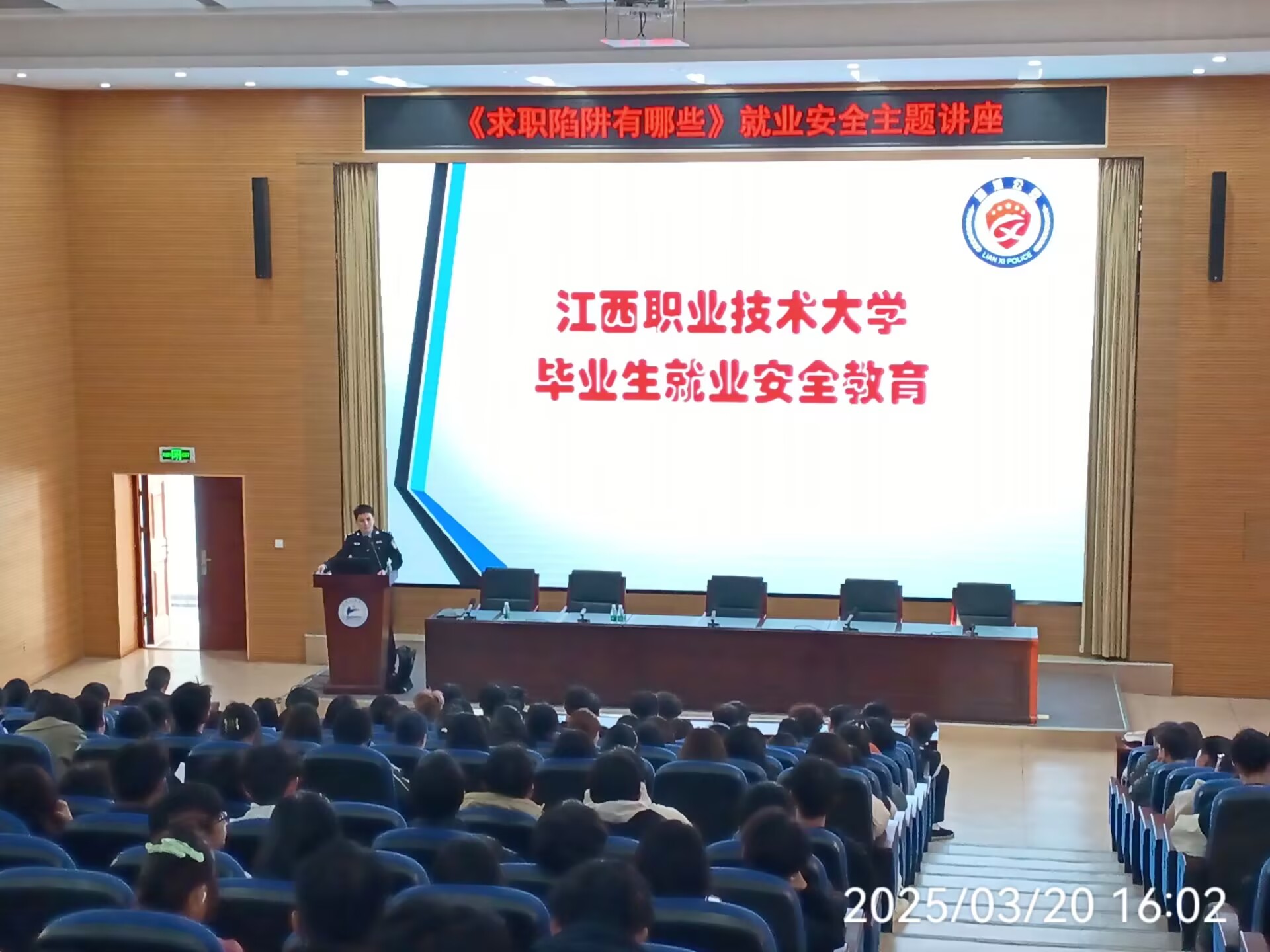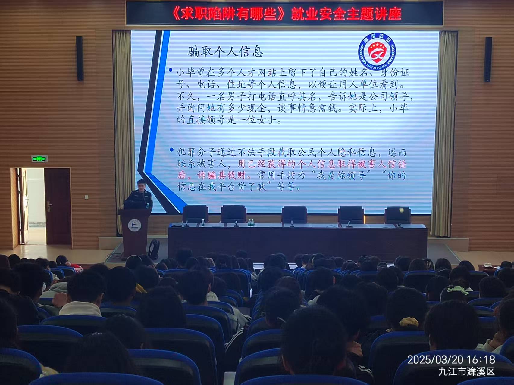 本网讯(招生就业处 保卫处)3月20日下午,我校在濂溪校区办公楼一楼报告厅举办“求职陷阱有哪些”就业安全主题讲座。本次讲座由招生就业处、保卫处联合举办,校大学生就业协会承办,特邀九江市公安局濂溪区分局十里派出所二级警长马维主讲。招就处、保卫处相关负责人,各二级学院负责就业的老师及在校生代表300余人到场聆听。