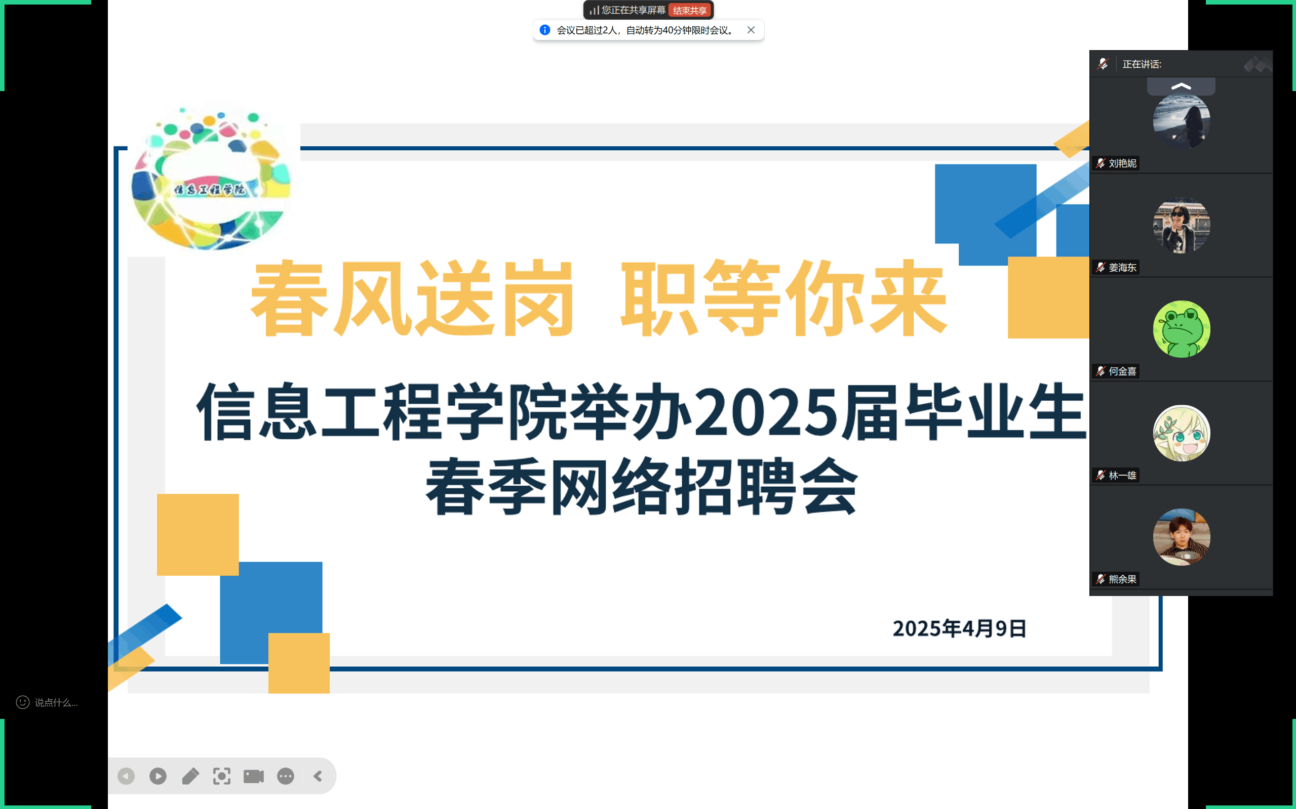 本网讯(信息工程学院)4月9日至11日,信息工程学院举办2025届毕业生春季网络招聘会。该院400余名毕业生线上参与,截至4月17日,共投递电子简历150余份,初步达成就业意向30余人。