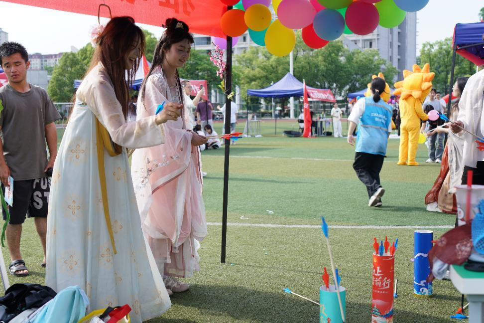 本网讯(信息工程学院)4月29日下午,信息工程学院心理发展部与清和汉韵文化传播学生协会在十里校区篮球场联合举办“雅歌投壶·心流解压”心理嘉年华游园活动,以汉服为文化载体,创新打造“射箭-投壶-解压”闭环体验,活动现场吸引了300余名学生参加,氛围十分热烈。