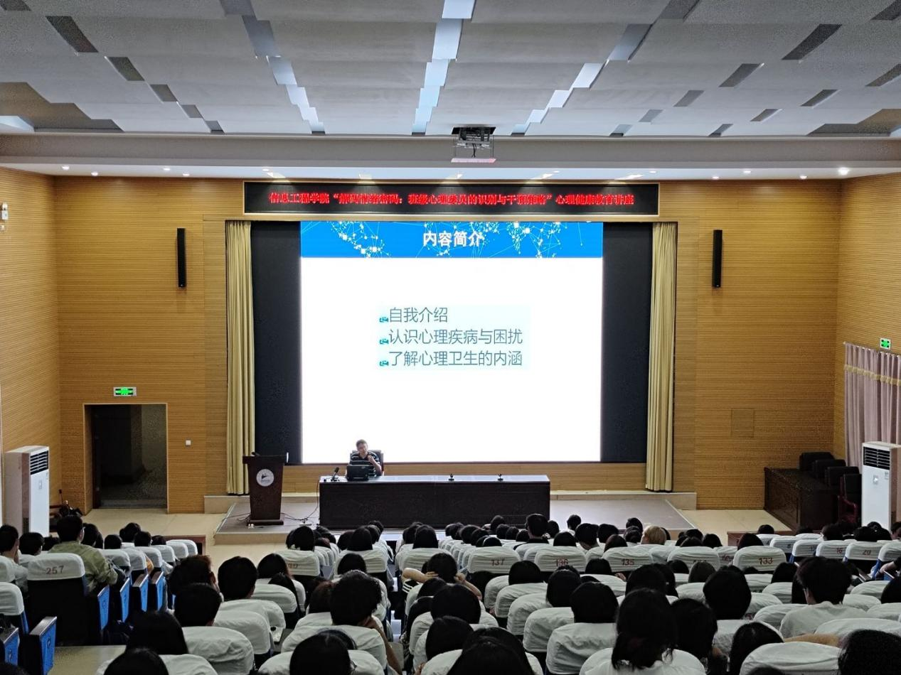 本网讯(信息工程学院)5月15日晚,信息工程学院在濂溪校区办公楼报告厅举办“关爱心理健康 提升互助技巧”主题大学生心理健康教育专题讲座,学工处副处长、马克思主义学院党支部书记陈志平担任主讲,该院副院长王法强主持,辅导员、班主任代表及部分班级心理委员、宿舍心理气象员等师生近300人参加。