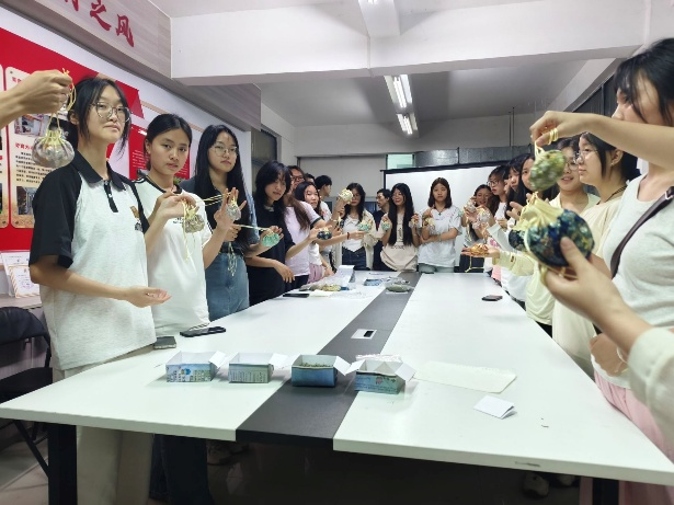活动中,同学们围坐在一起,全神贯注地投入到香囊制作中。他们手持针线,小心翼翼地将艾叶、薰衣草等散发着清香的草药填充进色彩斑斓的彩布里,用丝线将彩布缠绕成粽形、福袋等精美造型,经过制作,一个个独具匠心、各式各样的香囊在同学们的巧手下逐渐成型。为进一步加深同学们对传统文化的认知,活动还特别设置了传统文化知识问答环节,同学们纷纷踊跃参与,积极分享各自家乡独特的端午习俗。