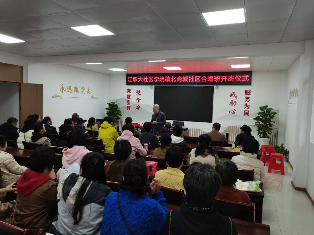 本网讯(继续教育学院)10 月 22 日上午,九江市濂溪区赣北商城社区新时代文明实践站内歌声悠扬、暖意融融,江西职业技术大学濂溪社区学院社区早校 2025 年秋季声乐班正式开课。来自赣北商城社区及周边社区的 100余名居民齐聚一堂,在贺锦致老师的专业指导下开启声乐学习之旅,用歌声奏响社区文化新生活。