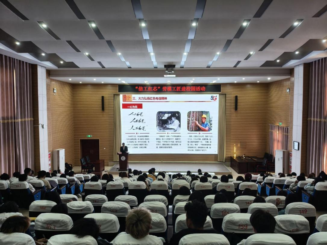 本网讯(信息工程学院)10月28日,信息工程学院在濂溪校区办公楼报告厅举办“信工红芯”劳模工匠进校园活动,特邀全国劳动模范、全国五一劳动奖章获得者、中国电信九江公司屈勇担任主讲嘉宾,近200名师生聆听讲座。