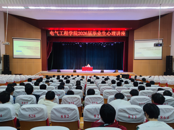 本网讯 (电气工程学院)为帮助毕业班级学生在踏上社会前调适心理,提前适应职场,10月31日晚7时,电气工程学院在十里校区大礼堂开展2026届毕业生心理讲座,特邀学工处副处长陈志平担任主讲,该院大三各班级学生踊跃参加。