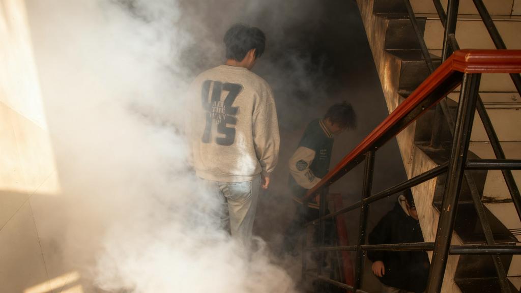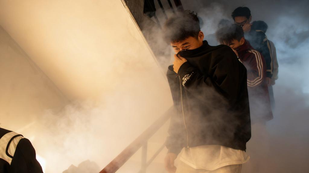 应急疏散演练阶段,模拟十里校区11栋宿舍发生火情。随着消防警报响起,宿舍楼内学生在疏导员的引导下,用湿毛巾捂住口鼻,低姿快速沿疏散通道有序撤离至馨园广场安全集结区。整个过程组织严密、响应迅速,展现了师生良好的应急素养。