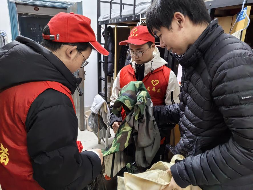 活动中,青年志愿者化身 “校园旧衣回收员”,手持回收袋走进学生宿舍,逐间上门收取旧衣物。他们认真收纳同学们整理好的旧衣、鞋帽、包包等物品,按照类别细致分拣、统一打包。遇到大件或数量较多的衣物时,志愿者主动搭手相助,全程细心周到、贴心暖心。尽管上下楼奔波、弯腰整理十分辛苦,大家依然干劲满满、热情不减。一袋袋旧衣被妥善归集,原本闲置的物品重焕新生,忙碌的身影与真挚的爱心,构成了校园里一道温暖动人的青春风景线。
