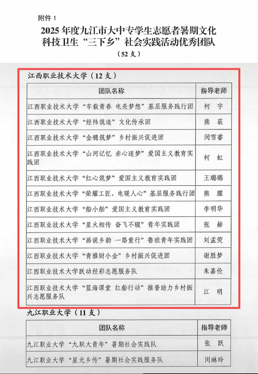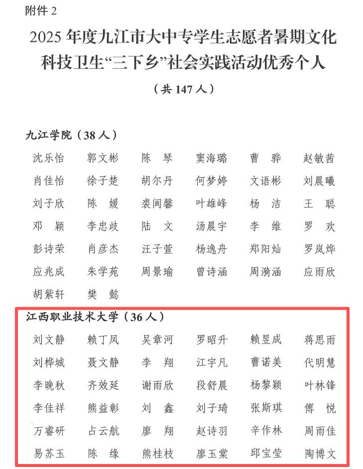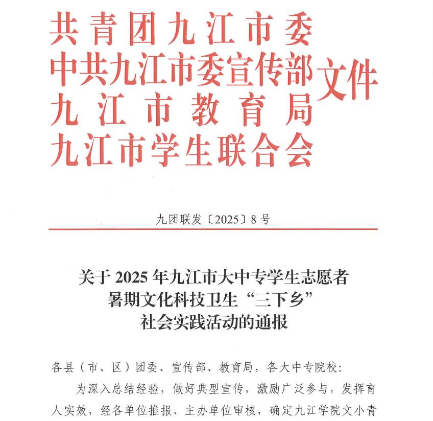 本网讯(校团委)近日,中共九江市委宣传部、共青团九江市委、九江市教育局、九江市学生联合会联合印发了《关于2025年九江市大中专学生志愿者暑期文化科技卫生“三下乡”社会实践活动的通报》,我校获评优秀团队12项、优秀指导教师12项,优秀个人36项。