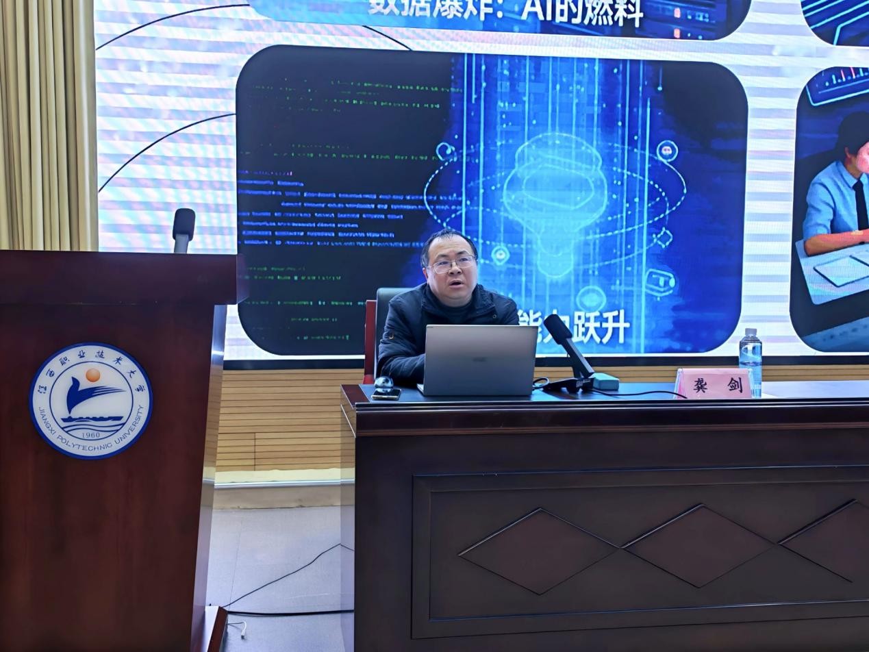 活动中,龚剑结合从业经验,从走进 AI、行业变革、职业新态等三个维度对当前人工智能的发展展开了系统解读,阐释了 AI 与日常学习生活的关联及核心价值,剖析其对金融、智能制造、教育等行业的重塑作用,解读复合型人才需求新特征。他还结合电子信息类专业特色介绍了 AI + 电子信息类核心适配岗位、跨专业通用 AI 岗位的技能要求,讲座内容贴合学生实际,干货满满,现场氛围热烈。