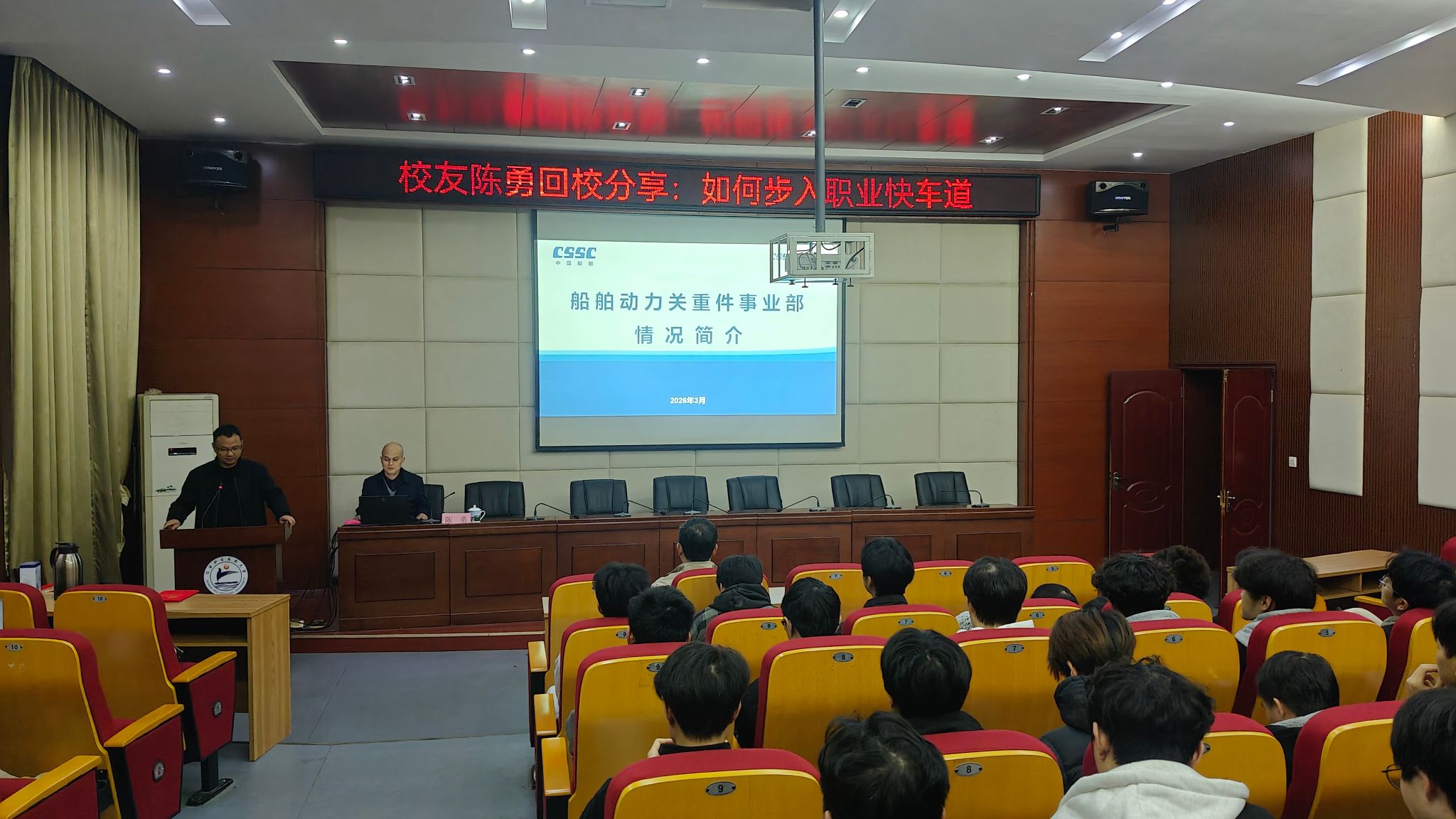 讲座伊始,陈勇结合自身职业发展经历,详细介绍了中船重庆装备下属船舶动力关重件事业部的战略定位、技术优势与行业前景,帮助同学们深入了解国有重点骨干企业的实际运作与人才需求,为未来职业选择提供参考。