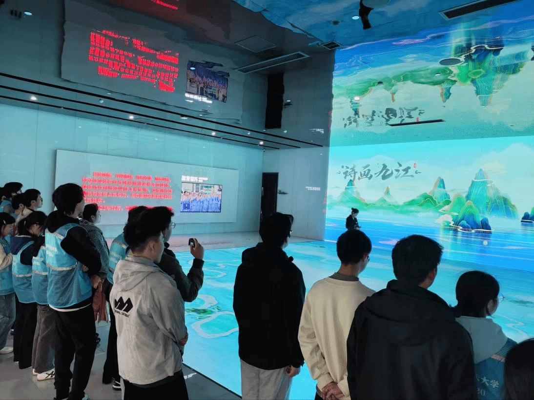 在展馆讲解员的专业引导下,同学们有序参观了各个核心展区。该规划馆以 “天下眉目之地 美好生态家园” 为核心主题,巧妙运用多媒体沙盘、数字互动装置、全景影像等现代化展陈技术,生动系统地呈现了九江的历史发展沿革、得天独厚的自然资源禀赋、当前城市空间格局及未来发展宏伟蓝图。