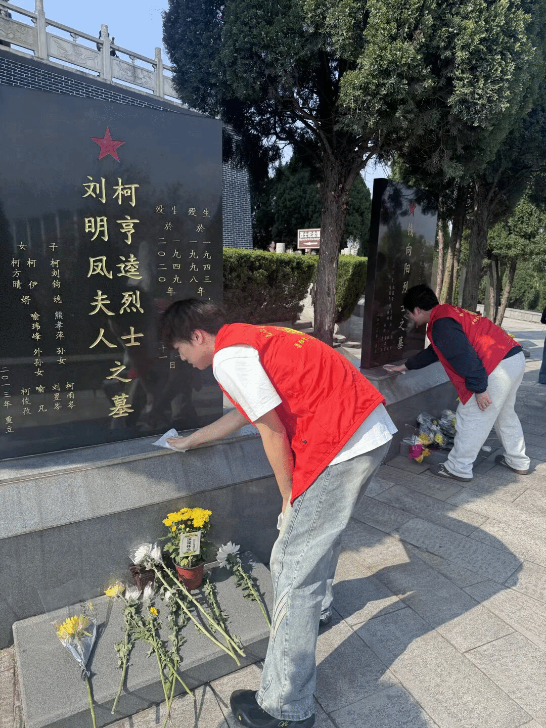 随后,全体人员来到烈士墓区。大家分组行动,拿出自带的扫帚、抹布等工具,认真清扫墓道上的落叶和尘土,仔细擦拭每一块墓碑,大家用朴实的劳动向革命先烈致敬。