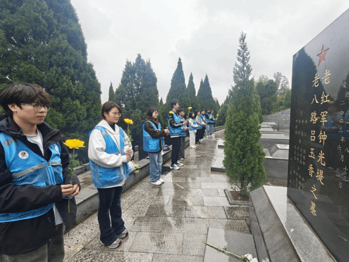 下午 2 时,烈士陵园苍松凝翠、庄严肃穆。同学们身着统一志愿服装,怀着崇敬之心有序步入烈士墓区。大家肃立碑前,轻轻擦拭墓碑浮尘,悉心摆放黄白菊花,随后低头默哀、深鞠一躬,以最庄重的方式,寄托对革命先烈的深切追思与无限敬意。在肃穆氛围中,同学们瞻仰英烈丰碑,重温先辈为民族解放浴血奋战的峥嵘岁月,深刻感悟今日幸福生活的来之不易。