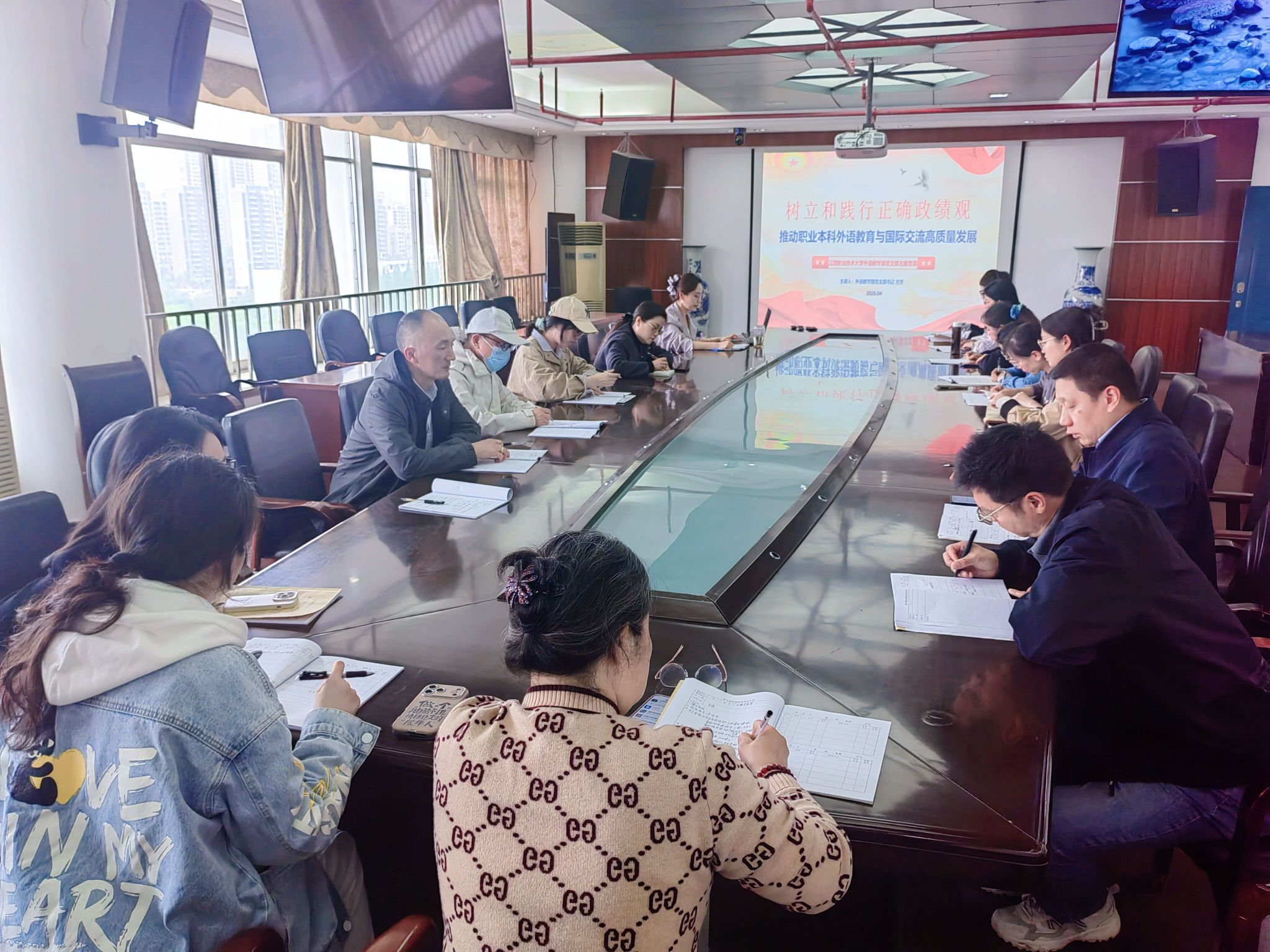 本网讯(外语教学部)4月14日下午,外语教学部党支部在十里校区3号教学楼12楼会议室举办“树立和践行正确政绩观 推动职业本科外语教育与国际合作交流高质量发展”专题党课。本次党课由党支部书记方芳主讲,部门全体教职工参会学习。