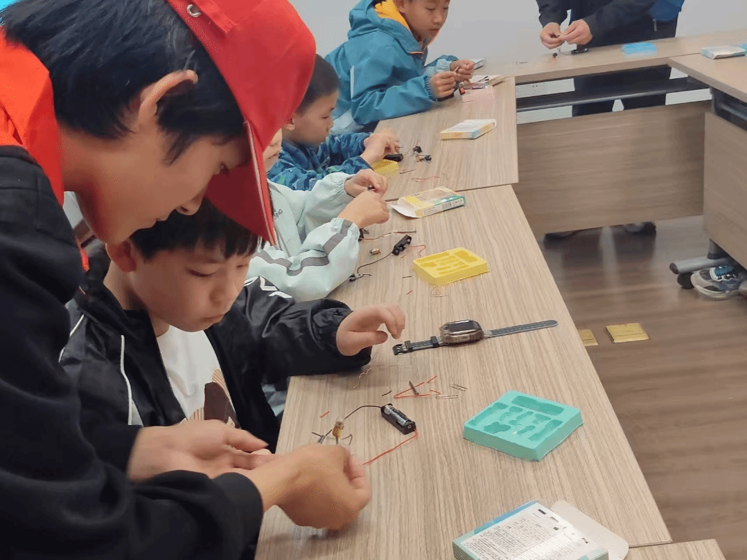 宣讲结束后,趣味电路实验正式拉开帷幕。志愿者们耐心细致地讲解电学基础原理,一步步示范简易电路的组装步骤,重点强调实操过程中的安全注意事项,全力保障孩子们的体验安全。随后,孩子们化身“小小电工”,分组动手实操,认真辨识电极、连接线路、组装器材,全程投入、一丝不苟。遇到电路不通、灯泡不亮等问题时,志愿者们一对一耐心引导,鼓励孩子们大胆尝试、独立排查故障,在反复调试中积累经验、突破自我。现场探究讨论的声音此起彼伏,每当有灯泡成功点亮,孩子们的欢呼声便响彻现场,在沉浸式动手体验中感受科学的魅力,收获了满满的科学探索成就感。
