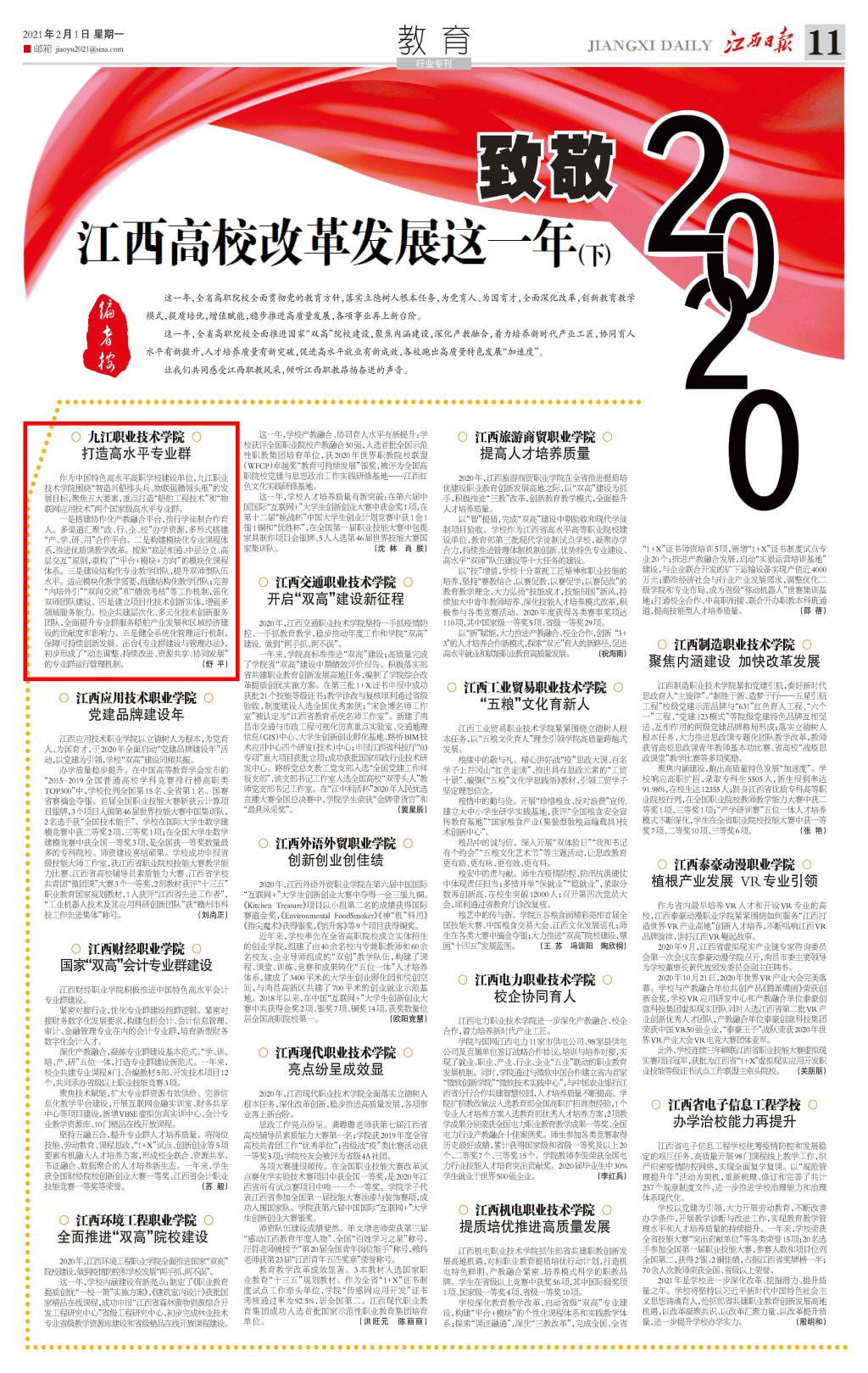 这一年,学校产教融合、协同育人水平有新提升:学校获评全国职业院校产教融合50强,入选首批全国示范性职教集团培育单位,获2020年世界职教院校联盟(WFCP)卓越奖“教育可持续发展”银奖,被评为全国高职院校党建与思想政治工作实践研修基地——江西红色文化实践研修基地。