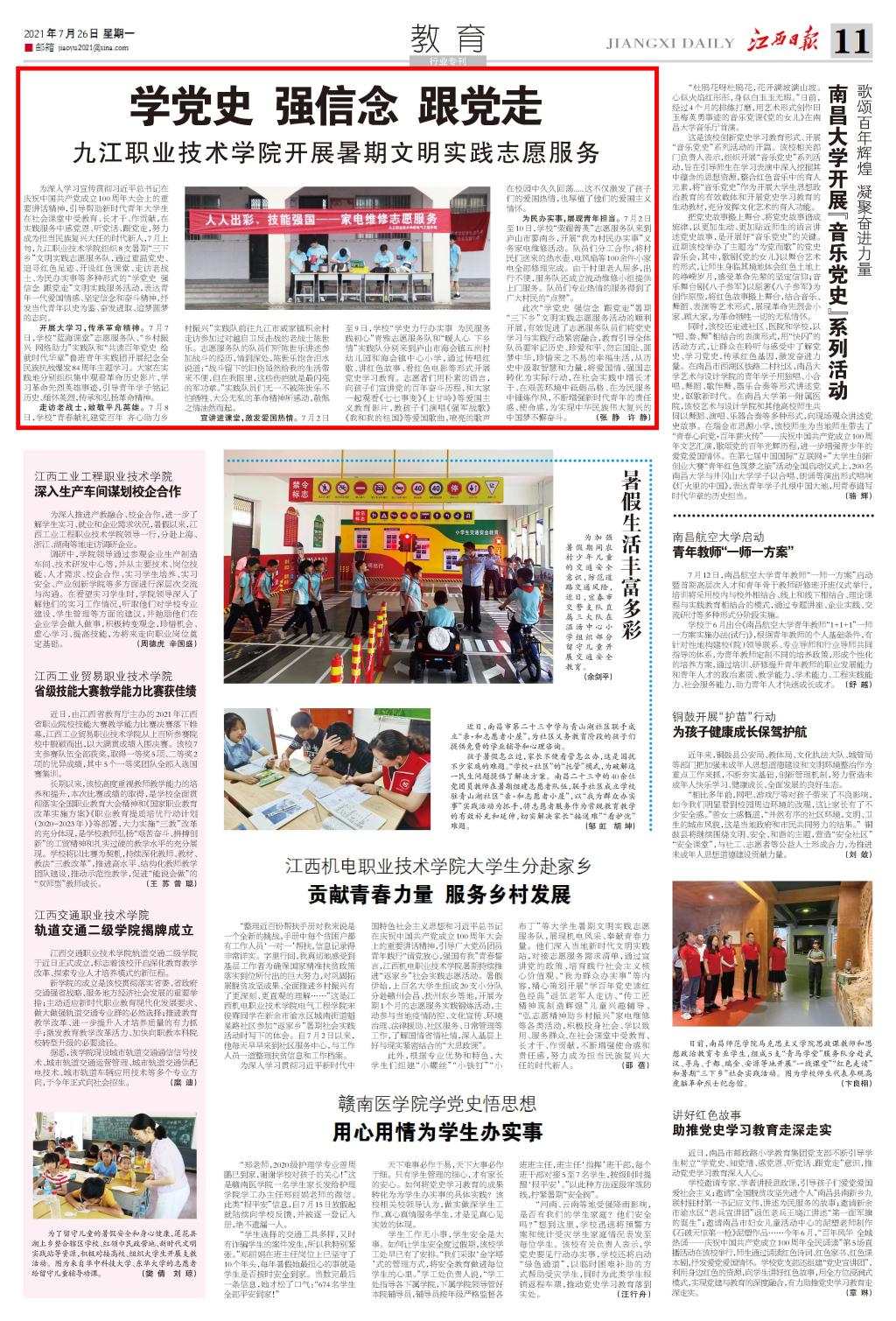 为深入学习宣传贯彻习近平总书记在庆祝中国共产党成立100周年大会上的重要讲话精神,引导帮助新时代青年大学生在社会课堂中受教育、长才干、作贡献,在实践服务中感党恩、听党话、跟党走,努力成为担当民族复兴大任的时代新人,7月上旬,九江职业技术学院组织8支暑期“三下乡”文明实践志愿服务队,通过重温党史、追寻红色足迹、开设红色课堂、走访老战士、为民办实事等多种形式的“学党史 强信念 跟党走”文明实践服务活动,表达青年一代爱国情感、坚定信念和奋斗精神,抒发当代青年以史为鉴、奋发进取、追梦圆梦的志向。